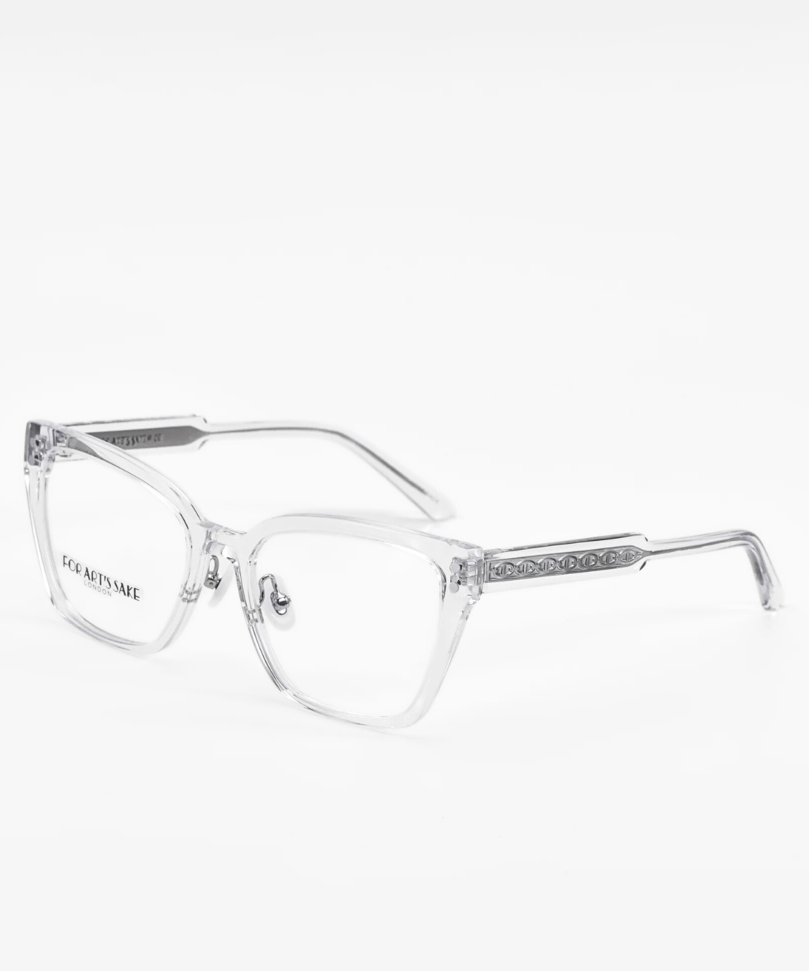 Offering a sleek and modern update to traditional cat-eye opticals, the 'Abbey' features a unique link-chain pattern temple core detail with the choice of 18-karat gold plated or palladium finishes.