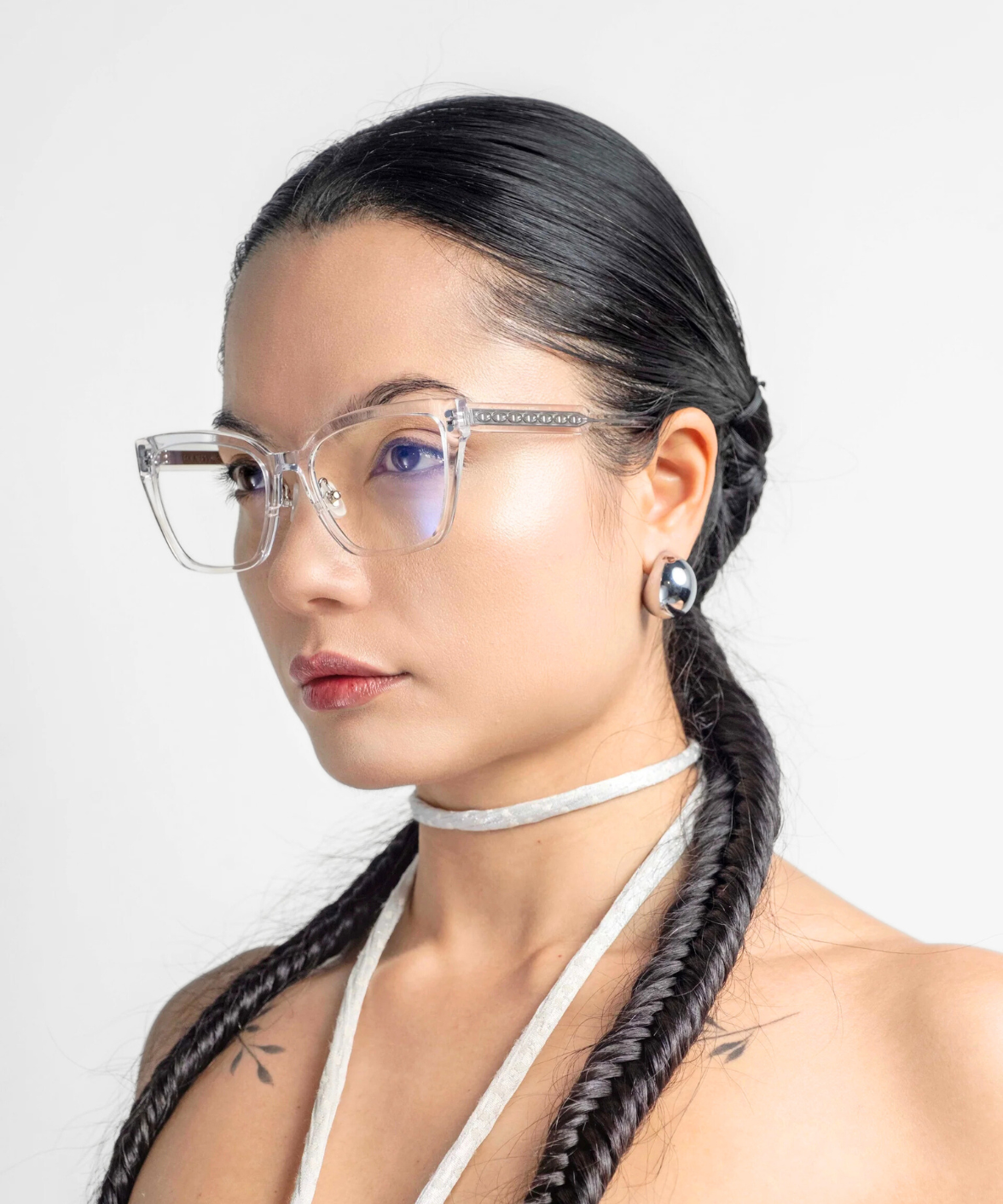 - Non-prescription clear lenses with a blue light filter and 100% UVA & UVB protection are included.
