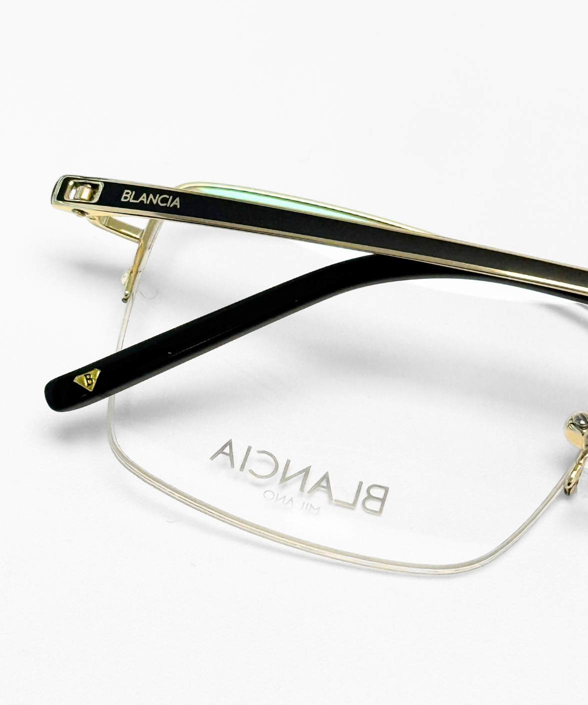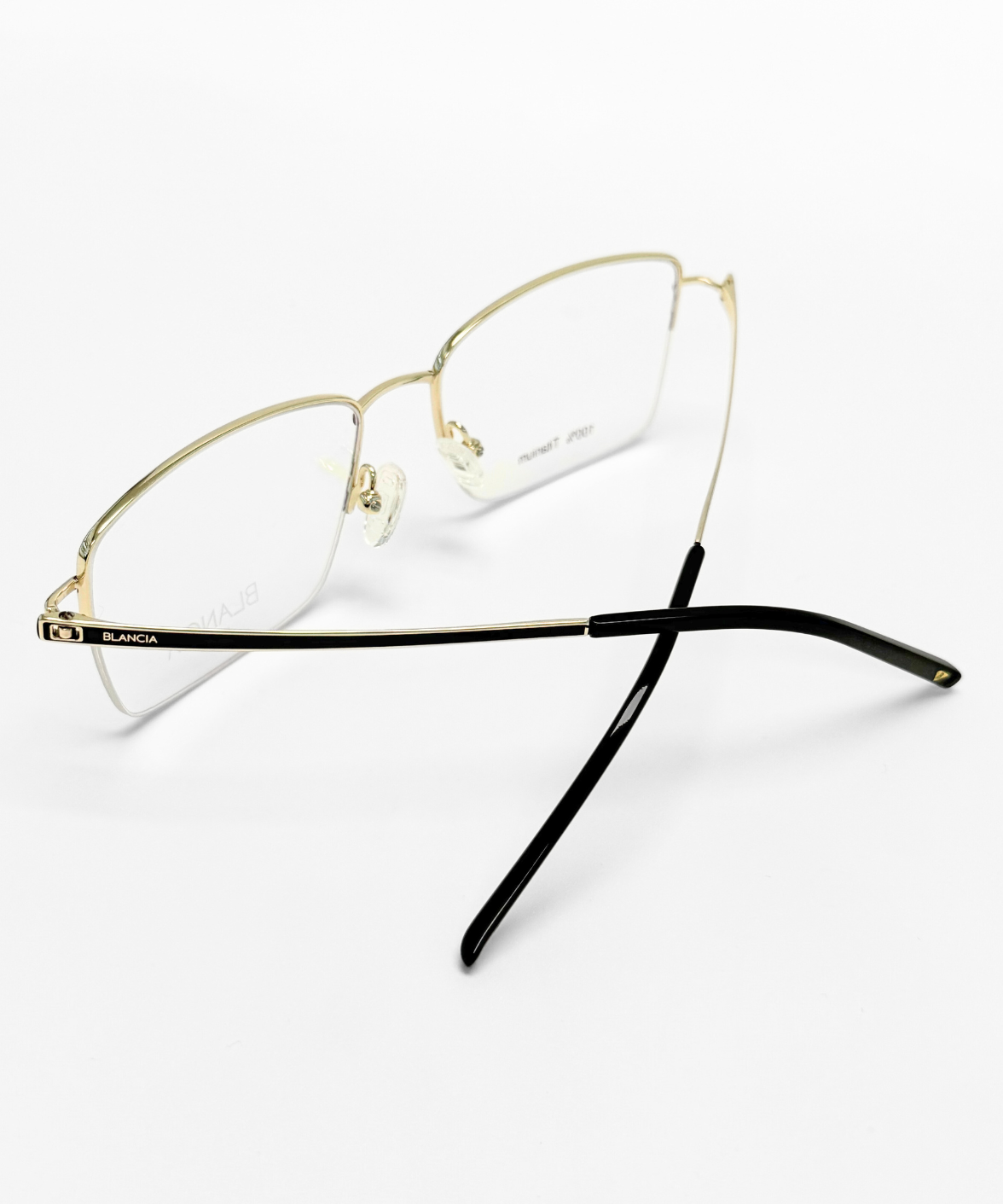 The Blancia BC389 eyeglasses feature a refined rectangular silhouette crafted from ultra-lightweight titanium. Designed with a semi-rimless structure and adjustable nose pads, the frame offers a clean architectural look while remaining comfortable for everyday wear. Finished in black and gold, BC389 balances precision, contrast, and understated design character.