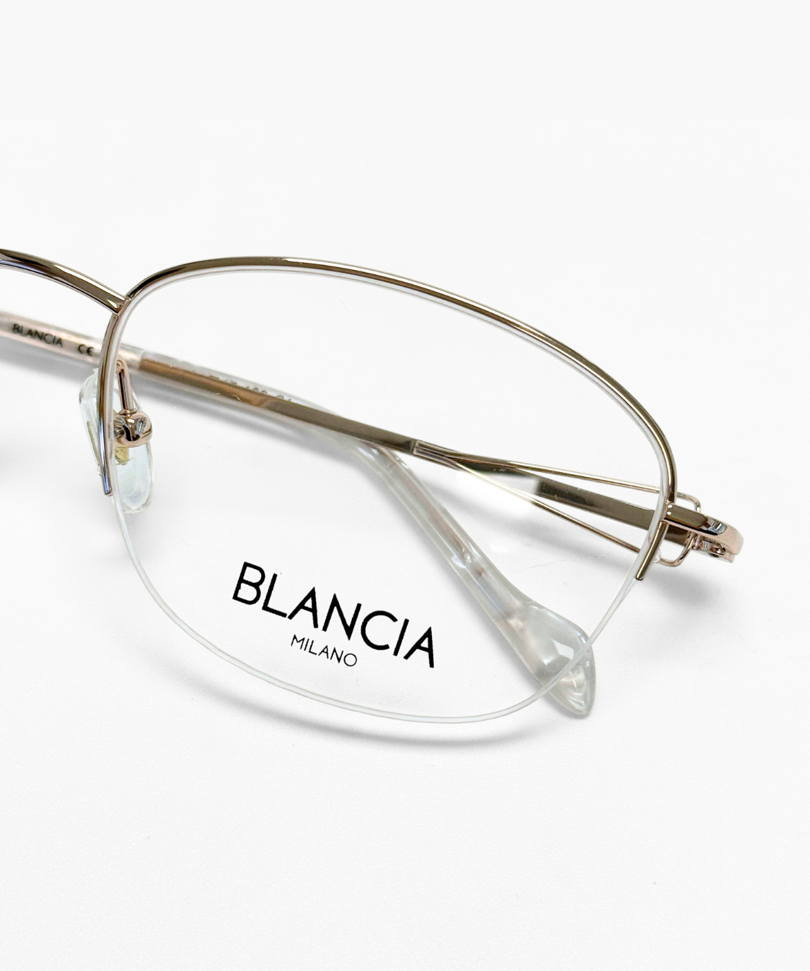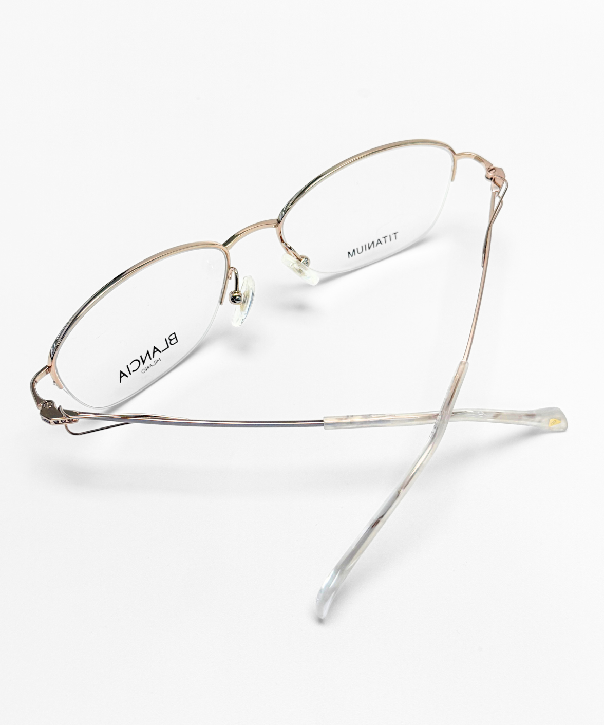 The Blancia BC455 eyeglasses feature a soft oval silhouette crafted from ultra-lightweight titanium. Designed with a semi-rimless structure, the gold-toned frame is paired with distinctive shell-white textured temples, adding subtle depth and contrast. Adjustable nose pads ensure lasting comfort, making BC455 a refined balance of design detail and everyday wearability.