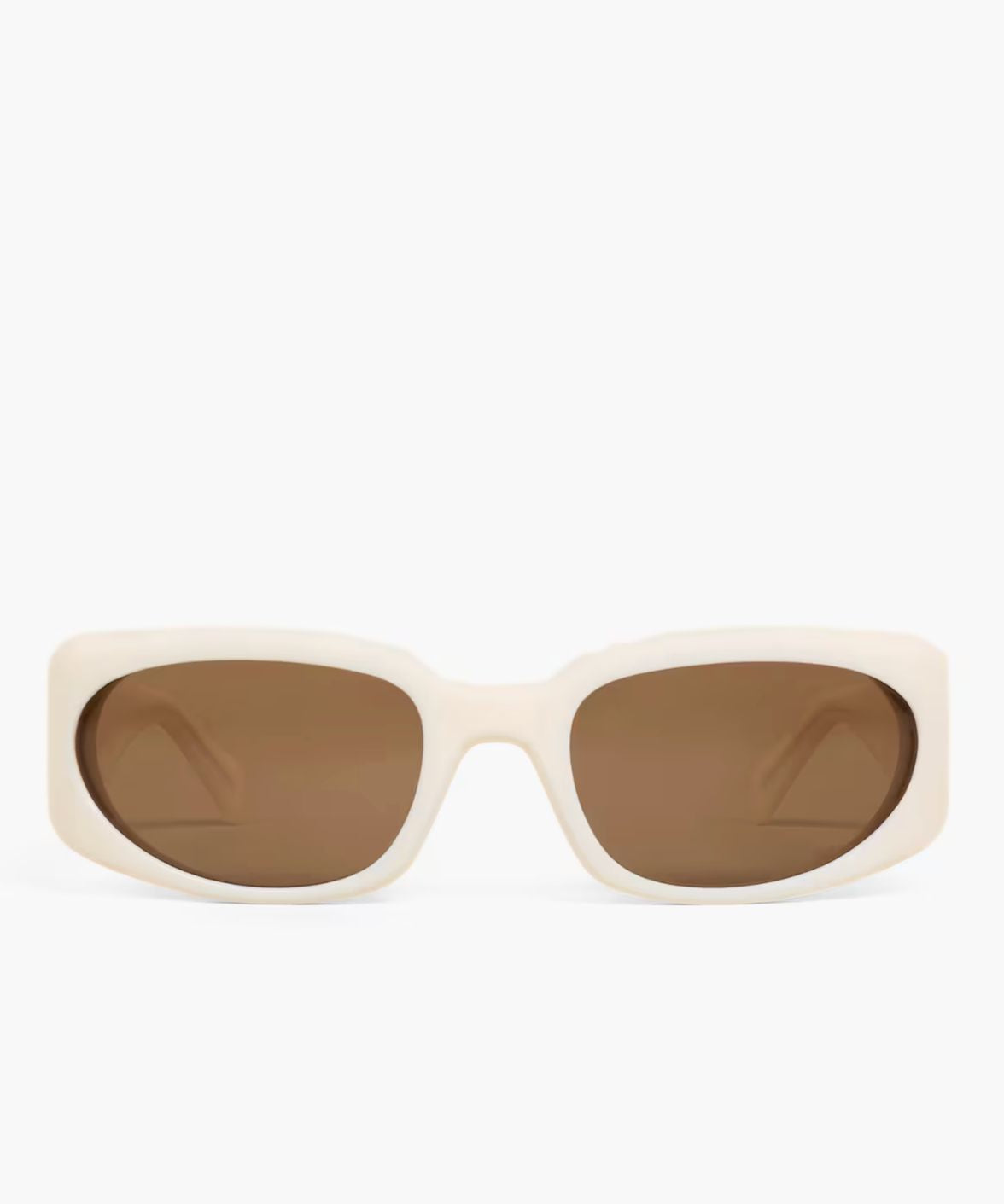 Crafted in Italy from glossy ivory acetate, this full-rim cat-eye silhouette combines geometric precision with feminine lift. The softly sculpted structure enhances the face with clean, architectural lines, while brown lenses provide 100% UV protection and balanced visual comfort.