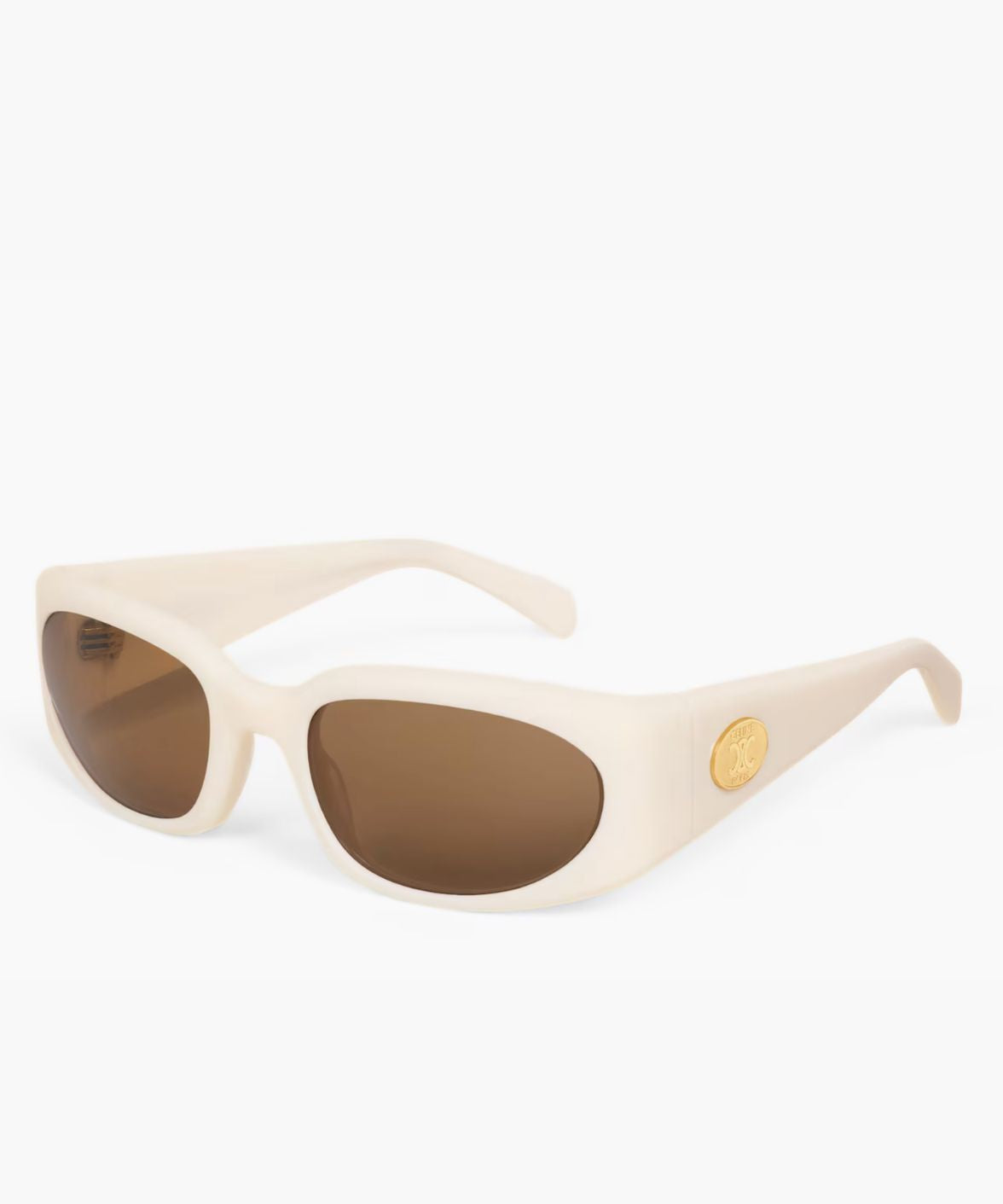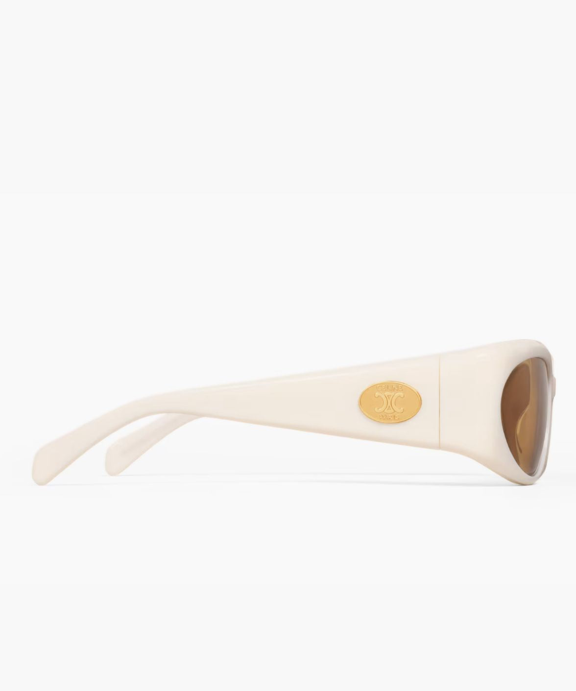 A newly introduced gold circular medallion at the temples redefines the house signature. Engraved with “Celine” and “Paris” and finished with a raised Triomphe emblem, it functions as both ornament and insignia—distinct, refined, and immediately recognizable.