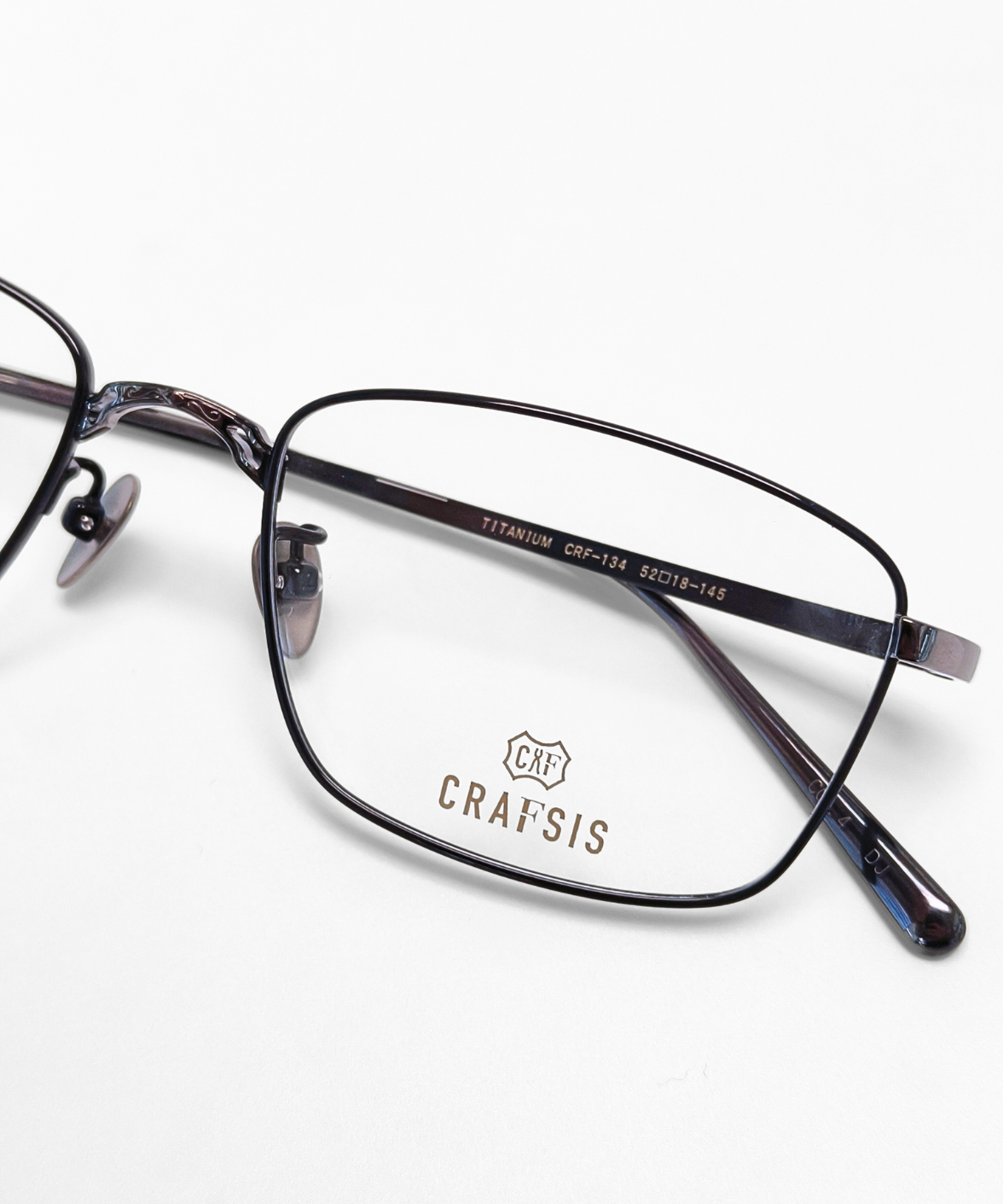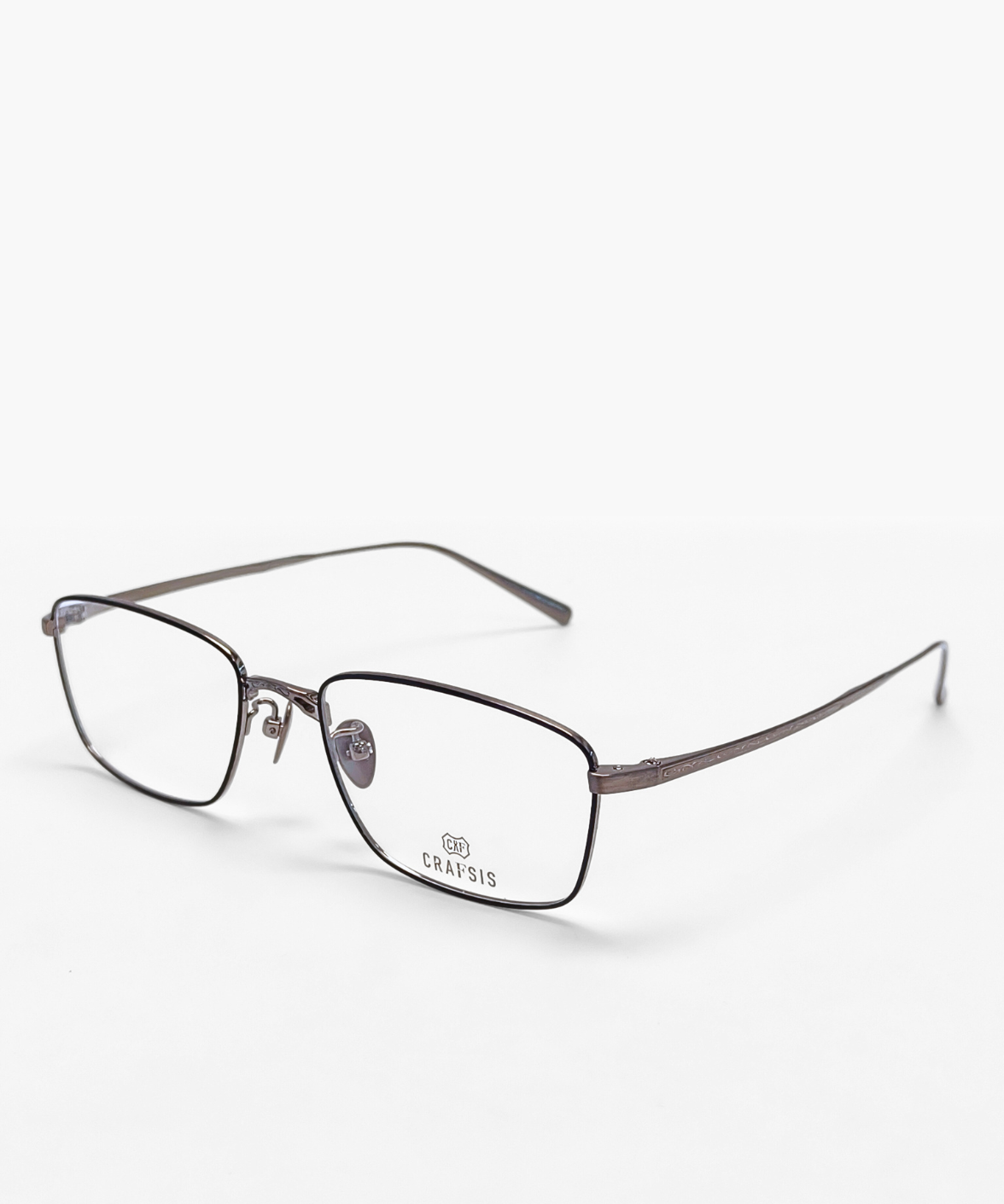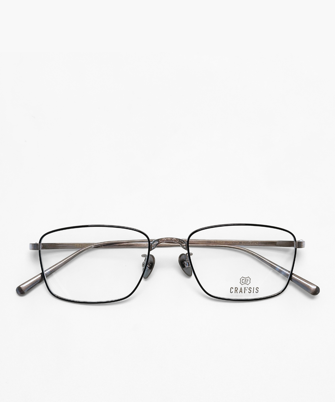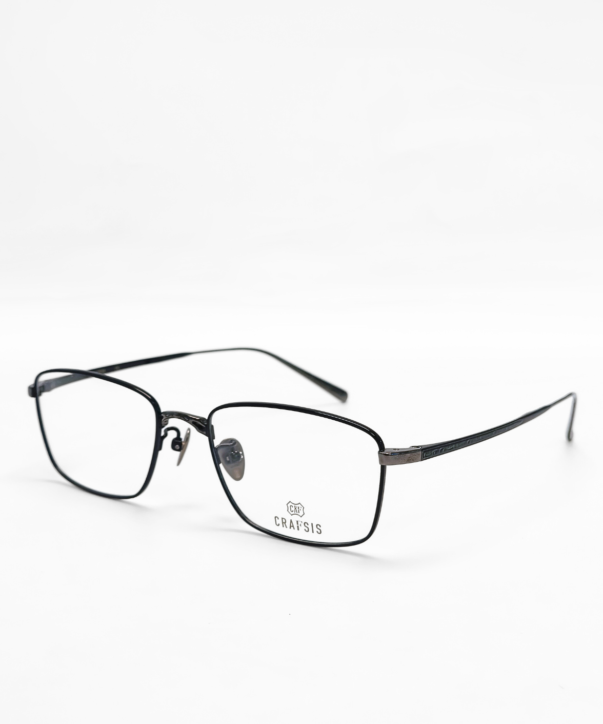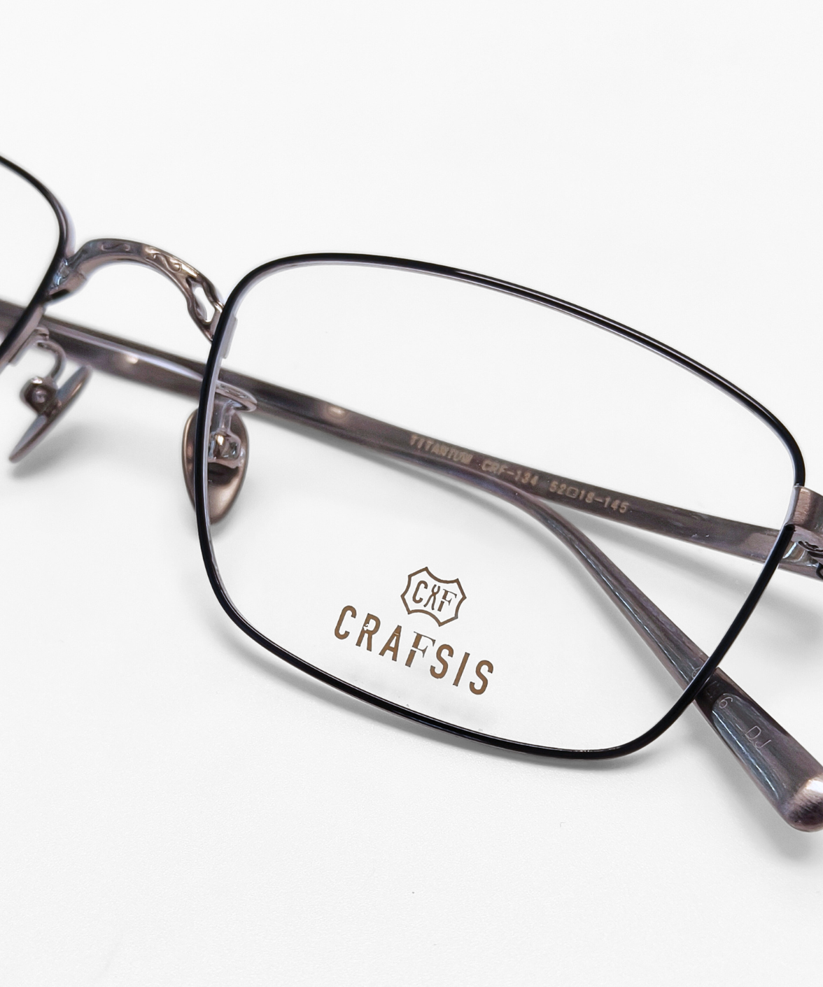 CRAFTSIS CRF-134 is a meticulously handcrafted rectangular frame in premium titanium. The full-rim design combines classic elegance with contemporary style, featuring engraved motifs on the bridge and temples that exude understated luxury. Available in dark grey/black (C4) and black/silver (C6), the contrasting colors on the rims and temples add a refined, eye-catching touch. Equipped with solid titanium nose pads for comfort and stability, CRF-134 is perfect for both professional and casual settings. The Crafsis logo is precisely laser-engraved on the tip of the left temple, highlighting its authentic craftsmanship.