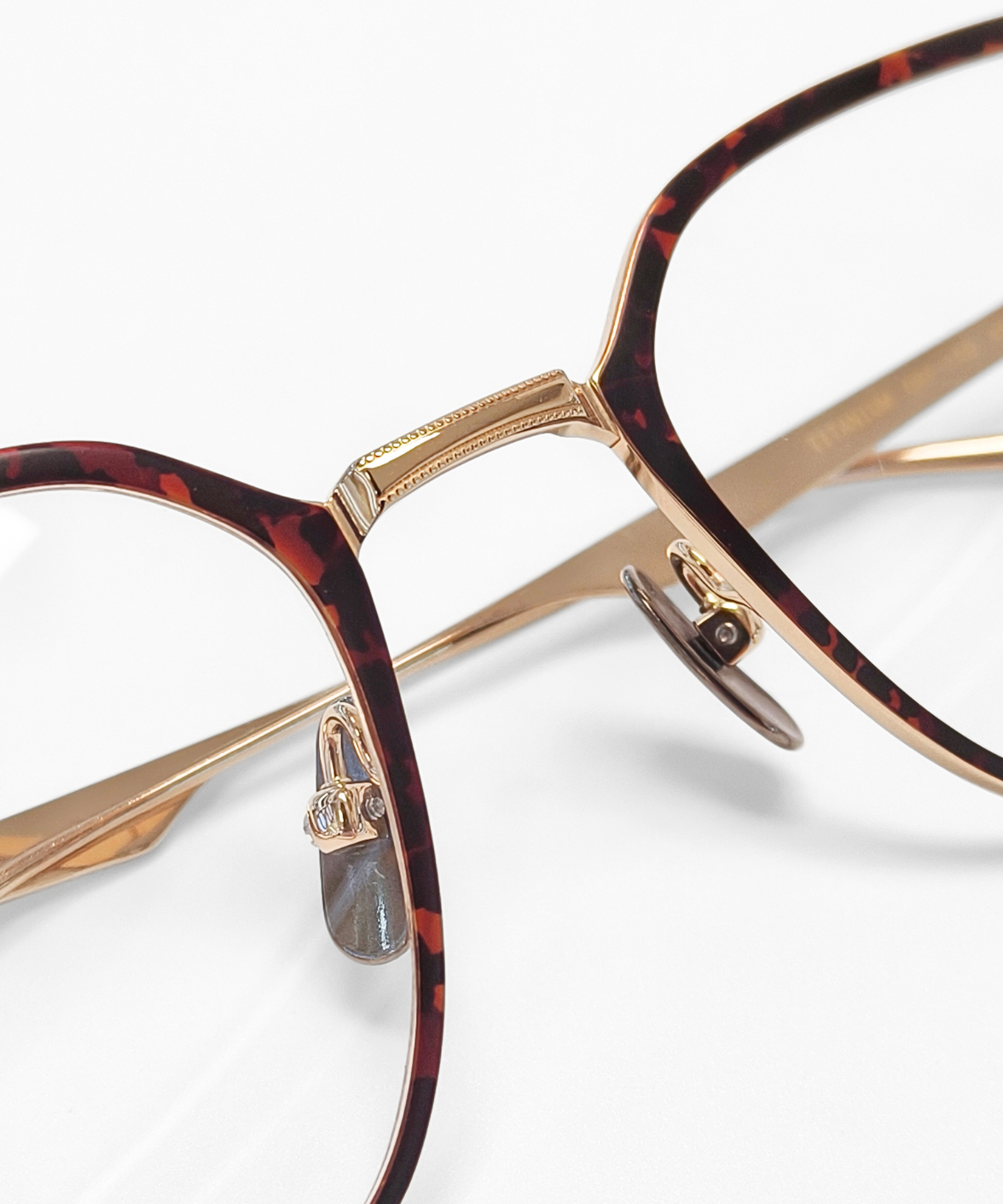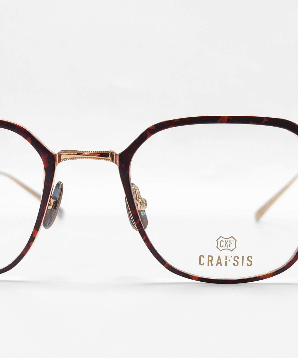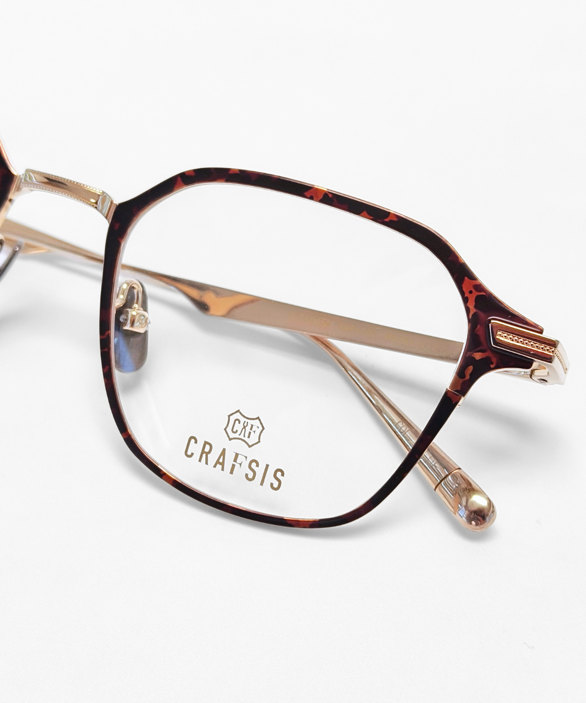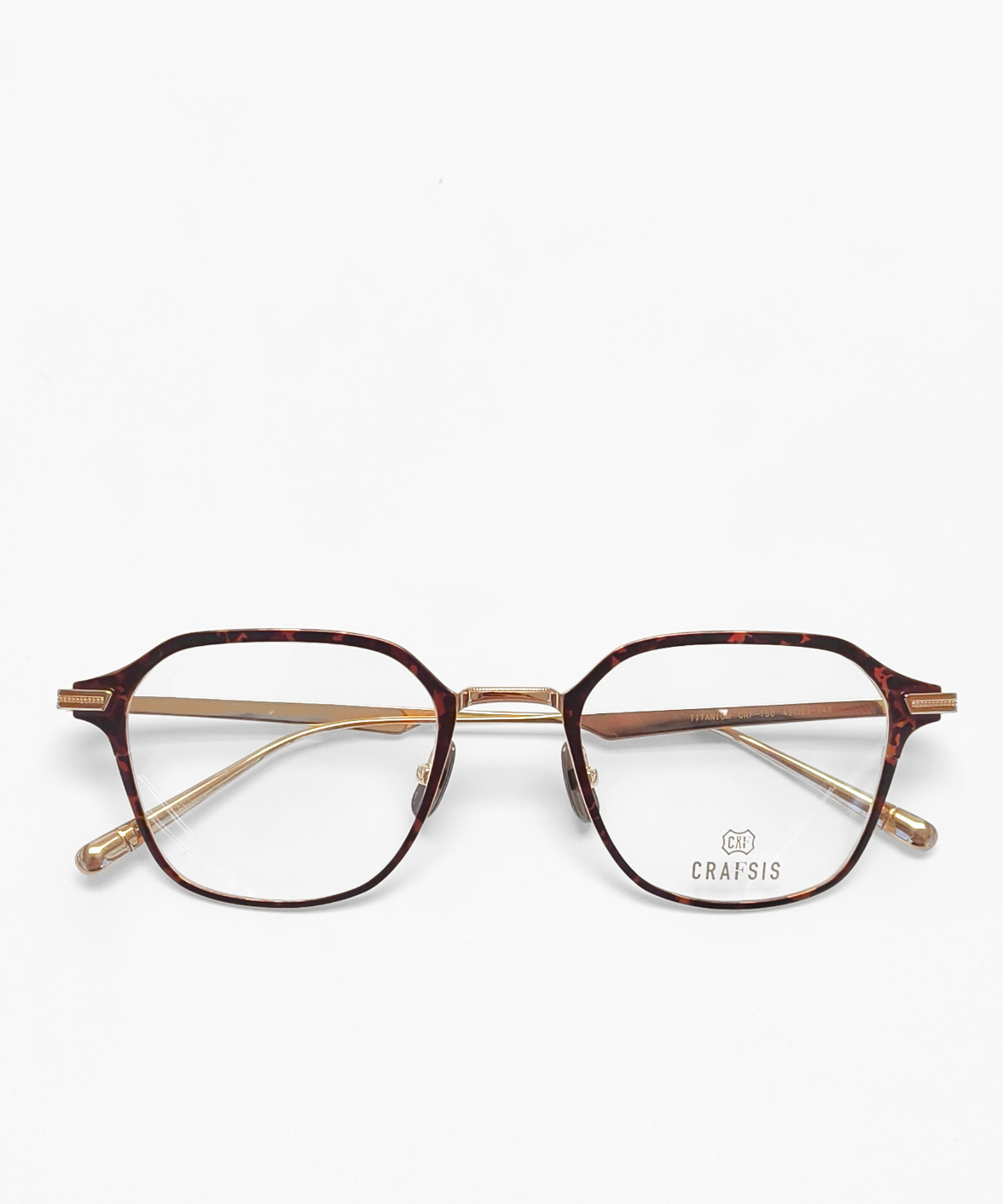 CRAFTSIS CRF-150 is a Japanese handcrafted geometric titanium eyeglass frame, featuring a distinctive hexagonal cut-out front for a subtle yet bold statement. The bridge and temples are decorated with intricate milled detailing, adding a refined accent to the cool, all-titanium design. Narrow temple tips ensure easy adjustment and a comfortable fit. Solid matte titanium nose pads enhance both comfort and the tactile premium feel. The Crafsis logo is discreetly laser-engraved on the left temple tip, highlighting meticulous Japanese craftsmanship.