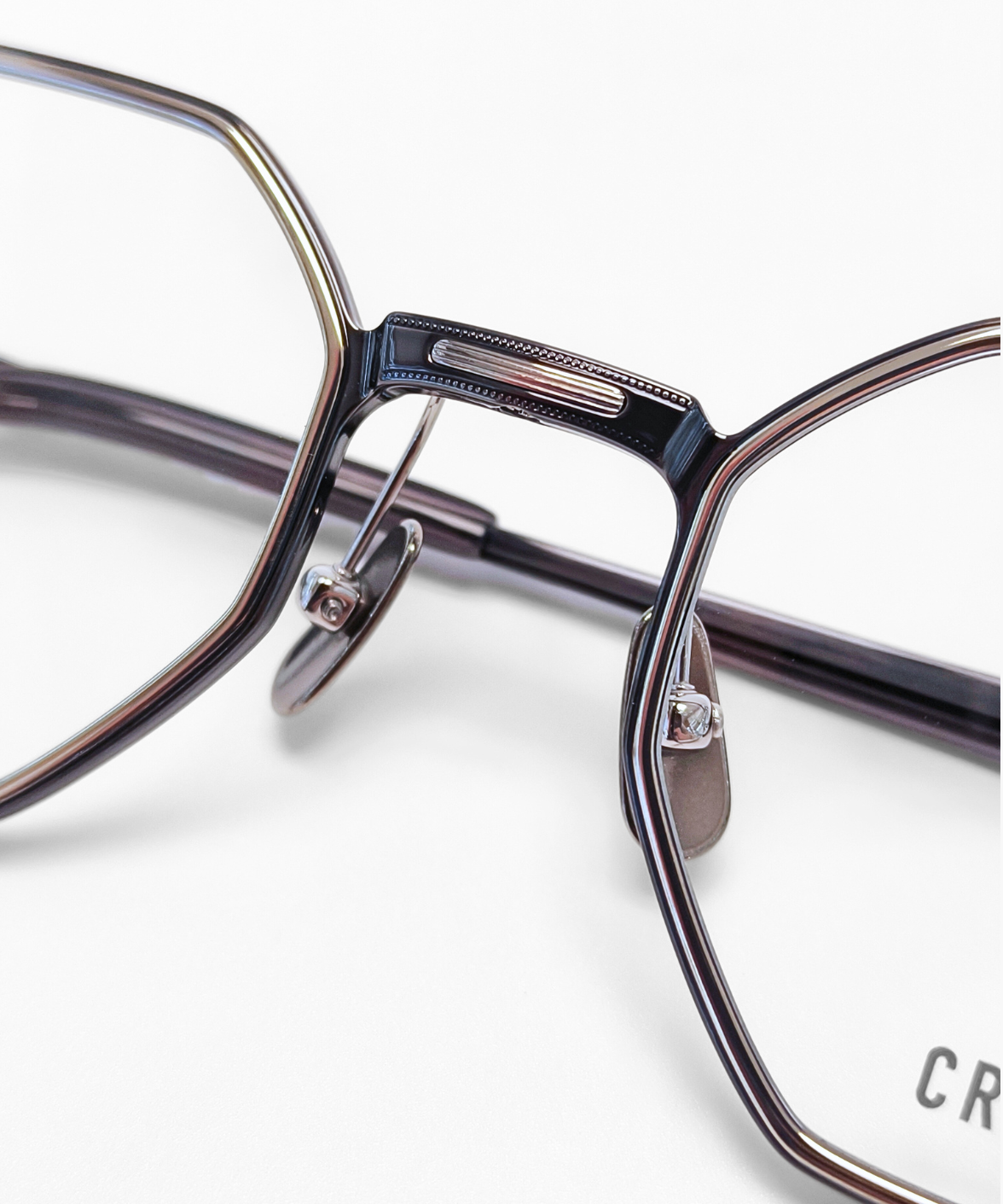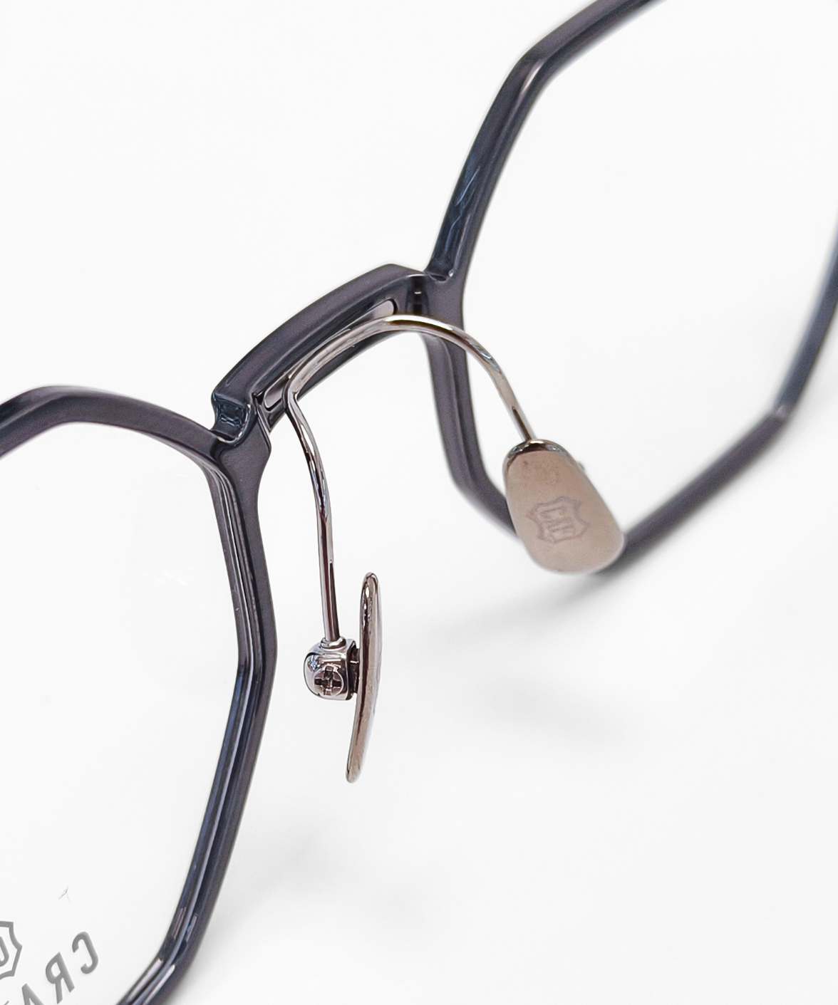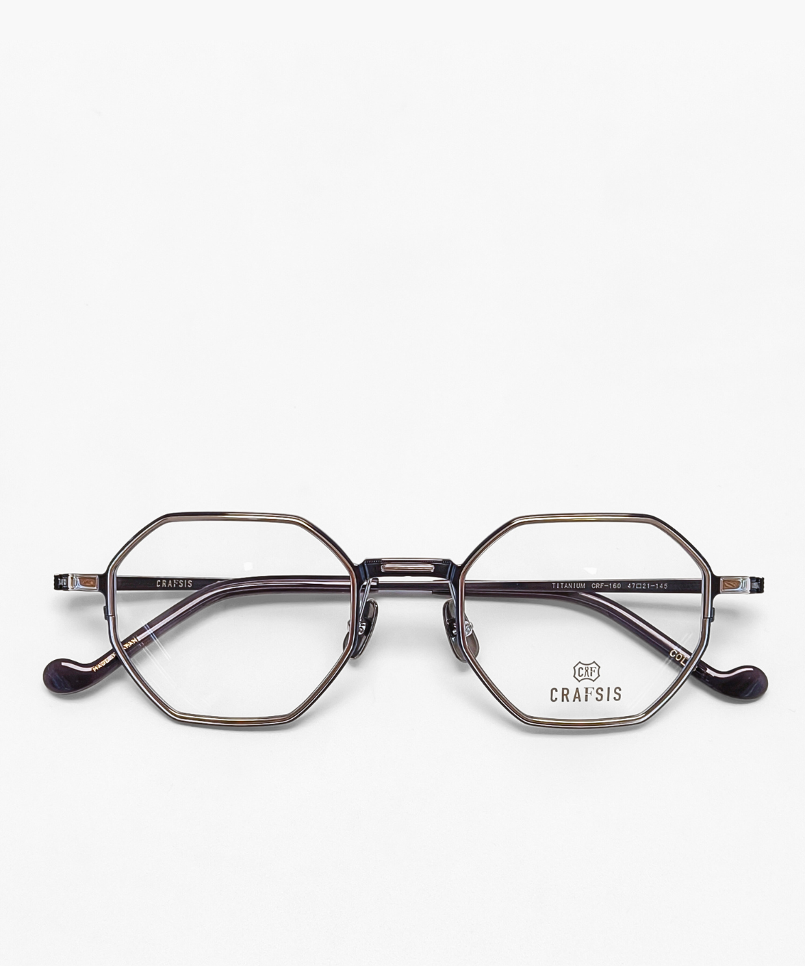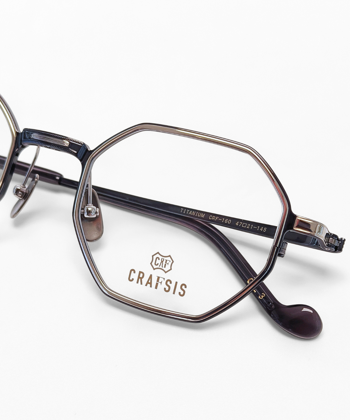 CRAFTSIS CRF-160 is a Japanese handmade geometric full-rim eyeglass frame featuring a bold octagonal shape. The bridge is subtly engraved with milled patterns and constructed with β-titanium clamps for secure assembly, while the front rim, bridge surface, and hinges are accented with muted point colors, creating understated yet distinctive style. Solid matte titanium nose pads enhance comfort and add a refined tactile quality. The Crafsis logo is engraved only on the left temple tip, emphasizing meticulous Japanese craftsmanship.