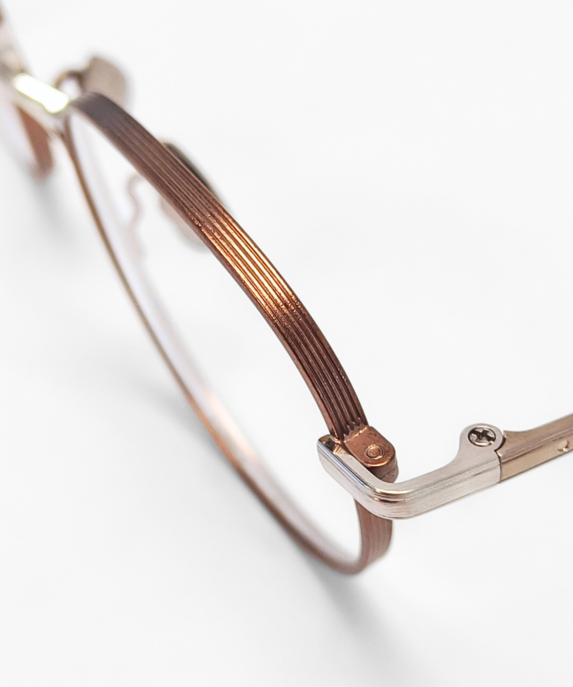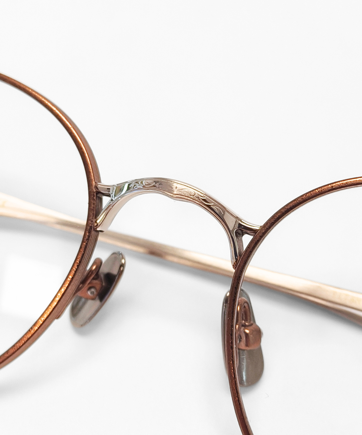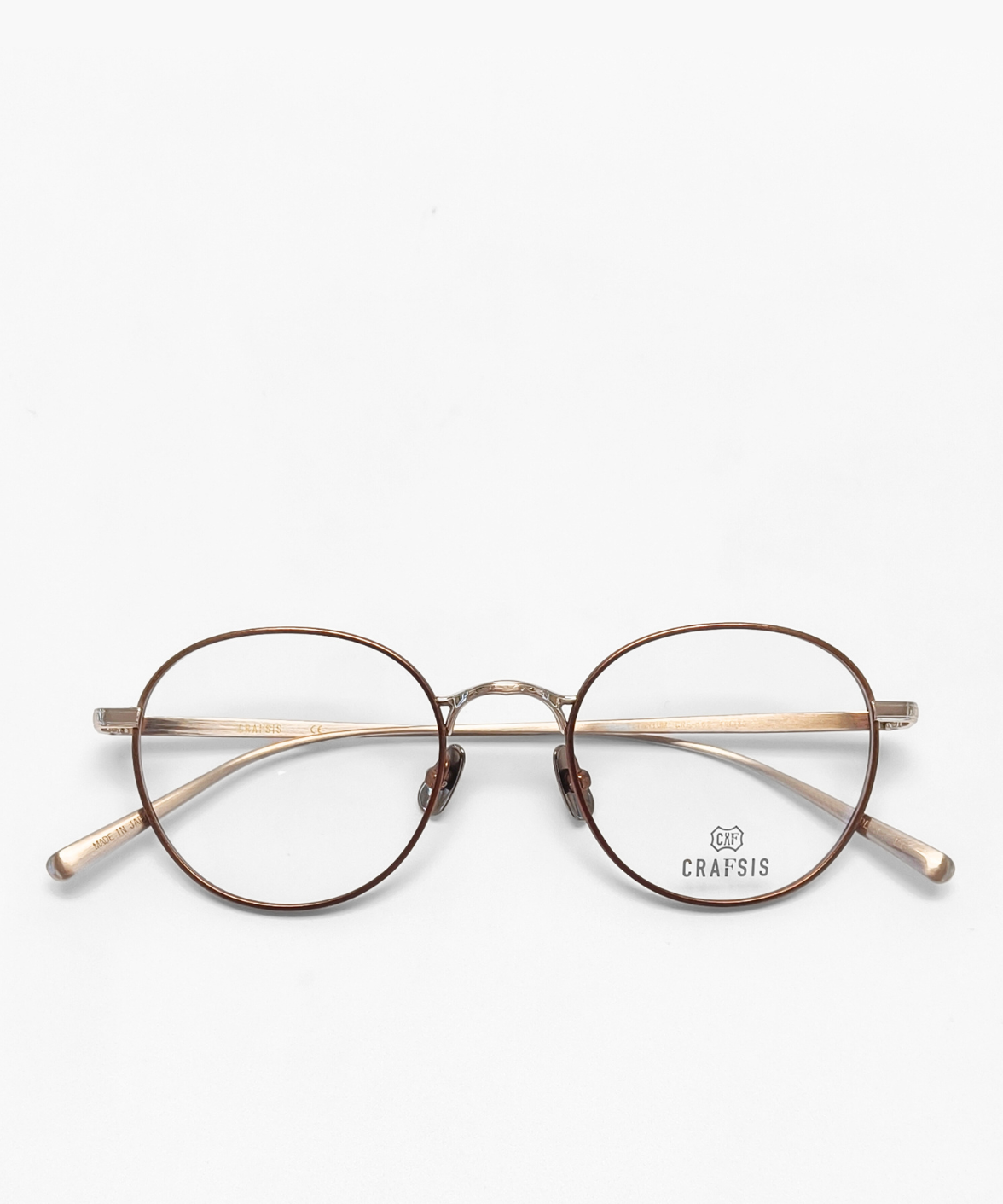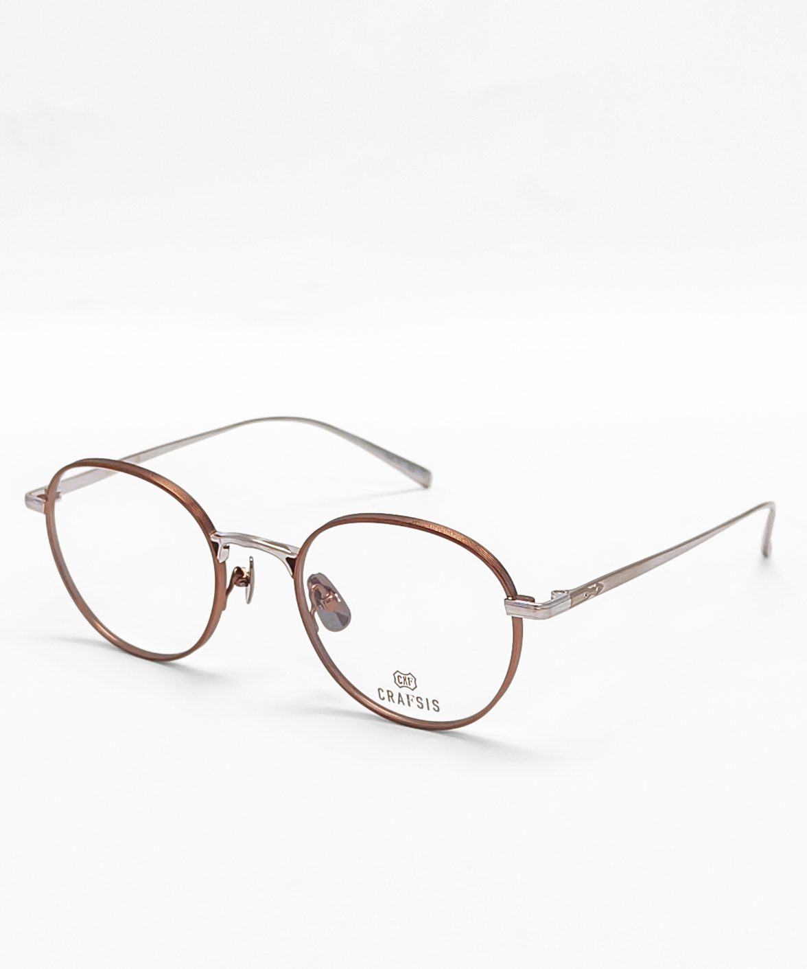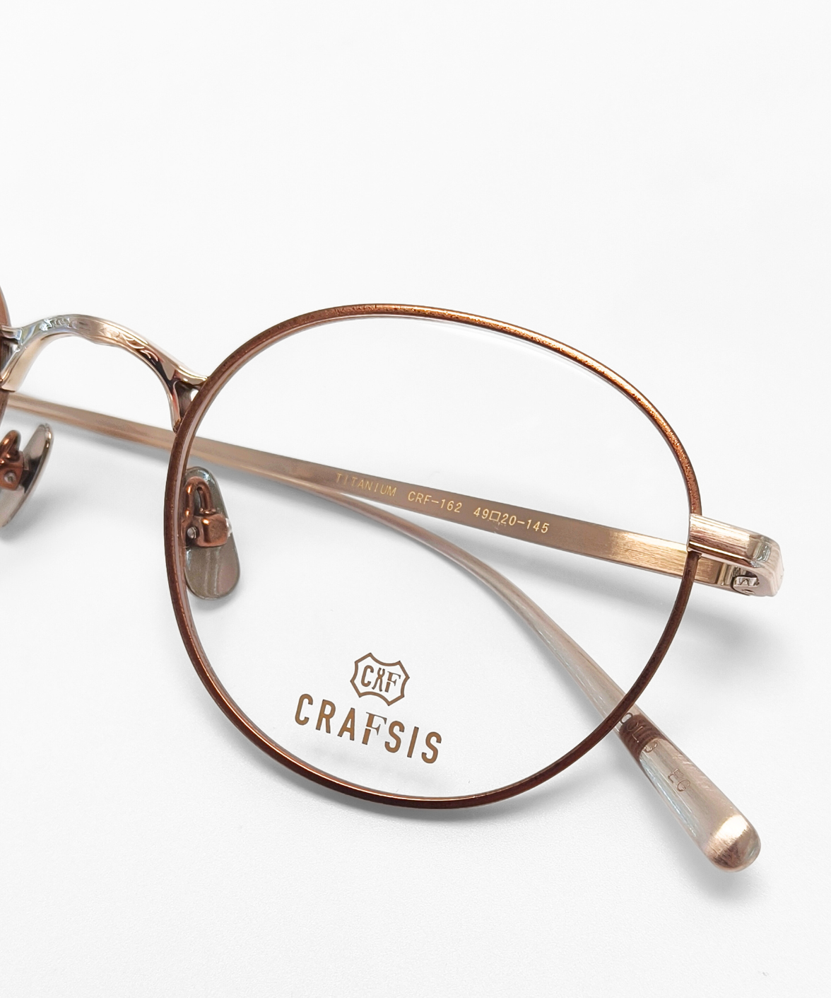 CRAFTSIS CRF-162 is a Japanese handmade round full-rim eyeglass frame in a classic Boston shape. The record-rim front is paired with β-titanium nose pads for comfort. A sophisticated two-tone finish is applied to the front rim, bridge, hinges, and temples, creating subtle visual depth. The three-dimensional bridge features engraved detailing, adding a vintage-inspired charm. The left temple tip carries the laser-engraved Crafsis logo, highlighting meticulous Japanese craftsmanship.