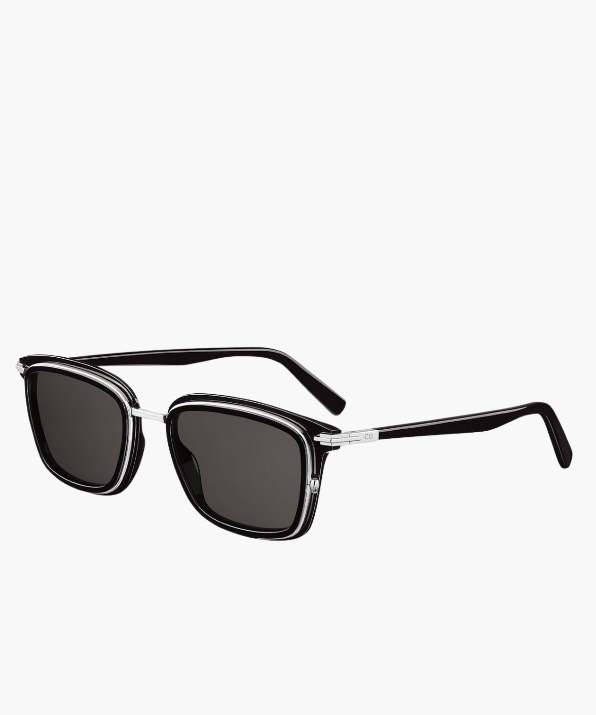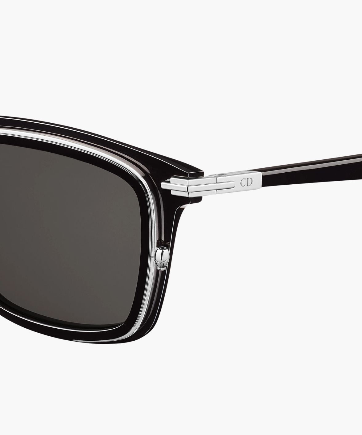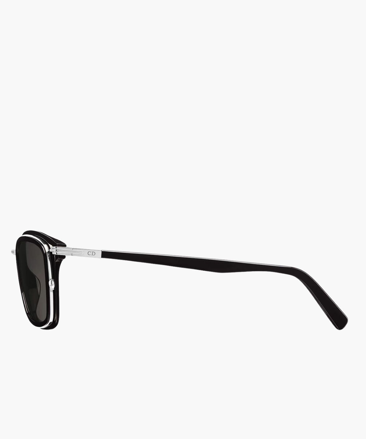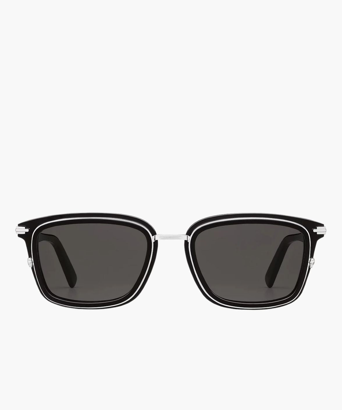 The DiorBlackSuit S18U sunglasses embody modern masculine elegance through a sleek rectangular silhouette. The black frame is defined by refined metal struts and subtle silver-finish edging that traces the grey lenses, creating a distinctive architectural outline. A silver-finish bridge and hinge detailing enhance the frame’s precision and polish. Crafted in Italy and fitted with lenses offering 100% UV protection, this design balances structure with understated sophistication.