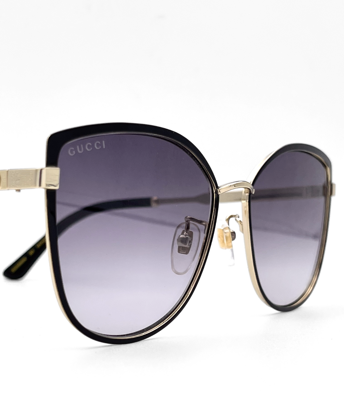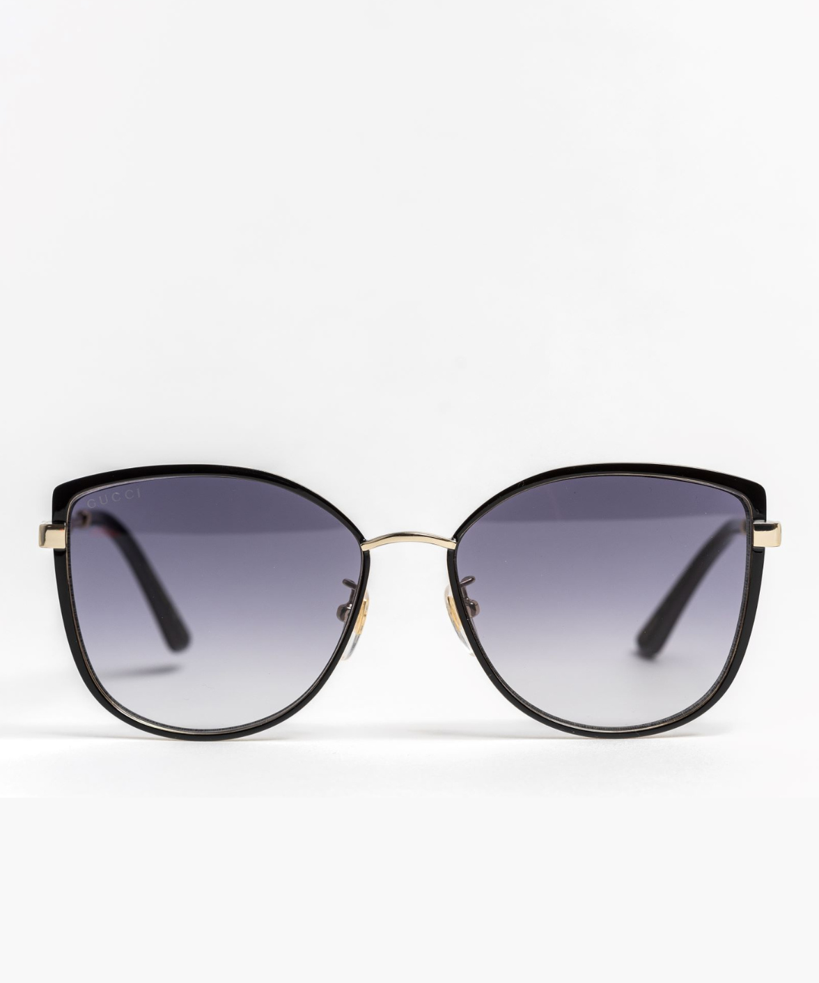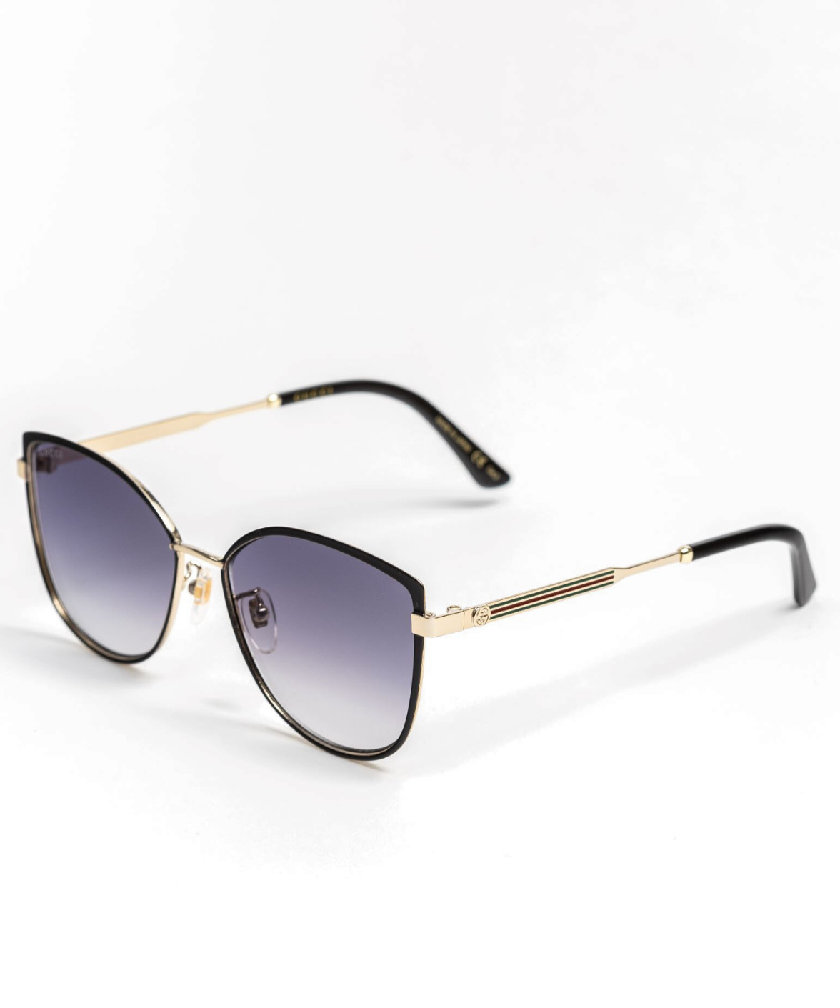 A refined metal cat-eye silhouette that blends a modern Korean-inspired design with Gucci’s iconic vintage Web detailing. The temples feature the Sylvie enamel accents and a subtle Interlocking GG, adding a signature touch to this elegant frame. Finished in a classic black-and-gold palette with gradient grey lenses, it offers a full-rim construction, adjustable nose pads, and 100% UV protection for effortless everyday wear.