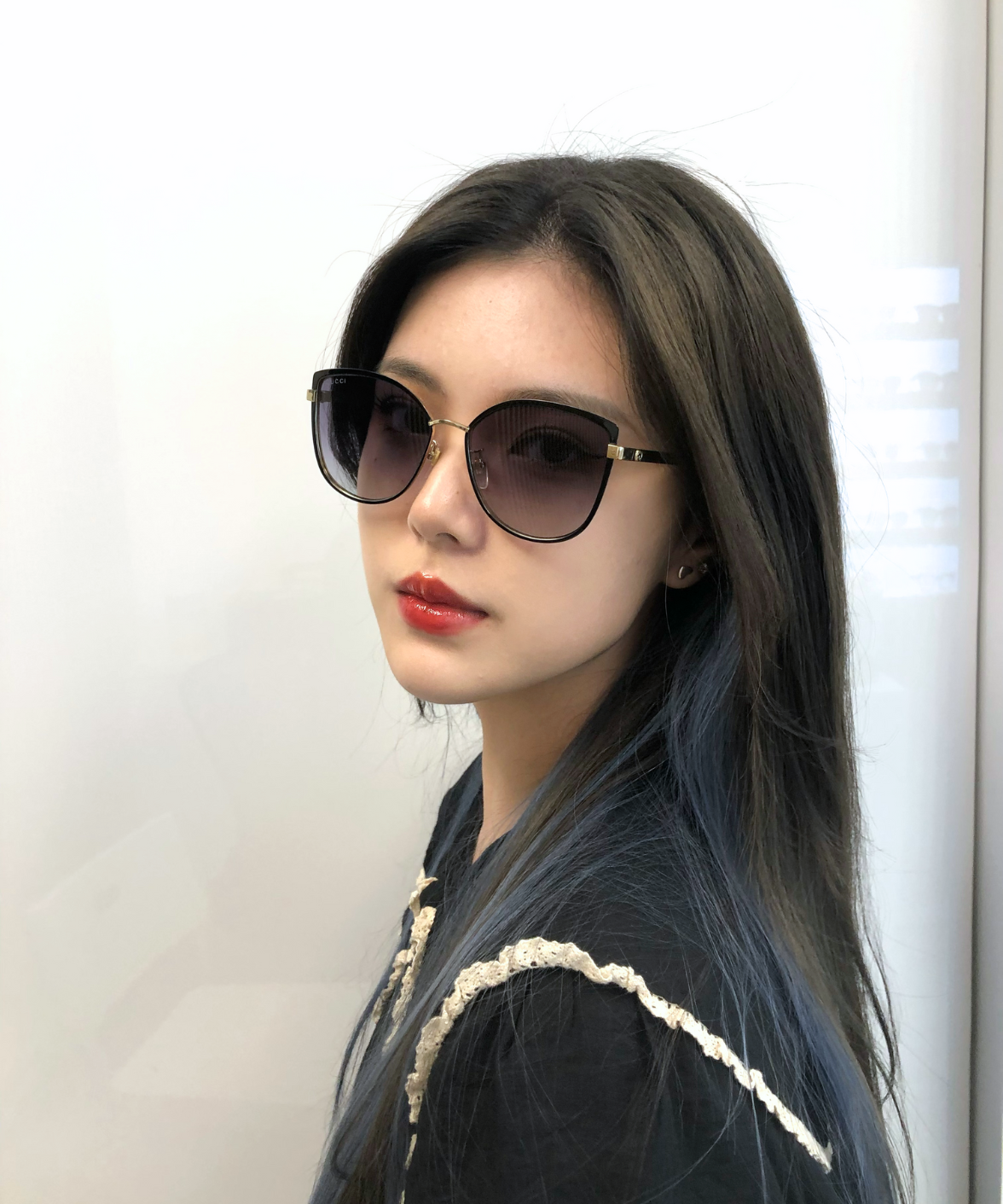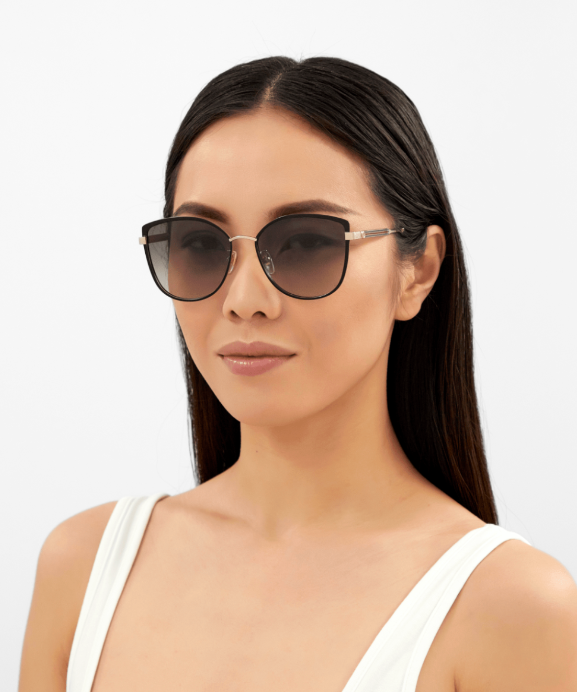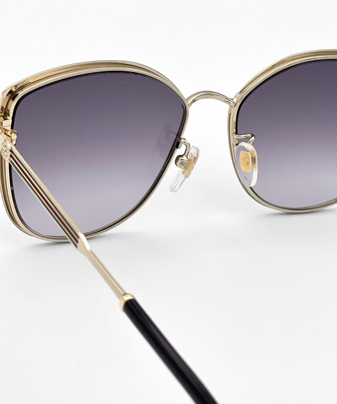 A refined metal cat-eye silhouette that blends a modern Korean-inspired design with Gucci’s iconic vintage Web detailing. The temples feature the Sylvie enamel accents and a subtle Interlocking GG, adding a signature touch to this elegant frame. Finished in a classic black-and-gold palette with gradient grey lenses, it offers a full-rim construction, adjustable nose pads, and 100% UV protection for effortless everyday wear.