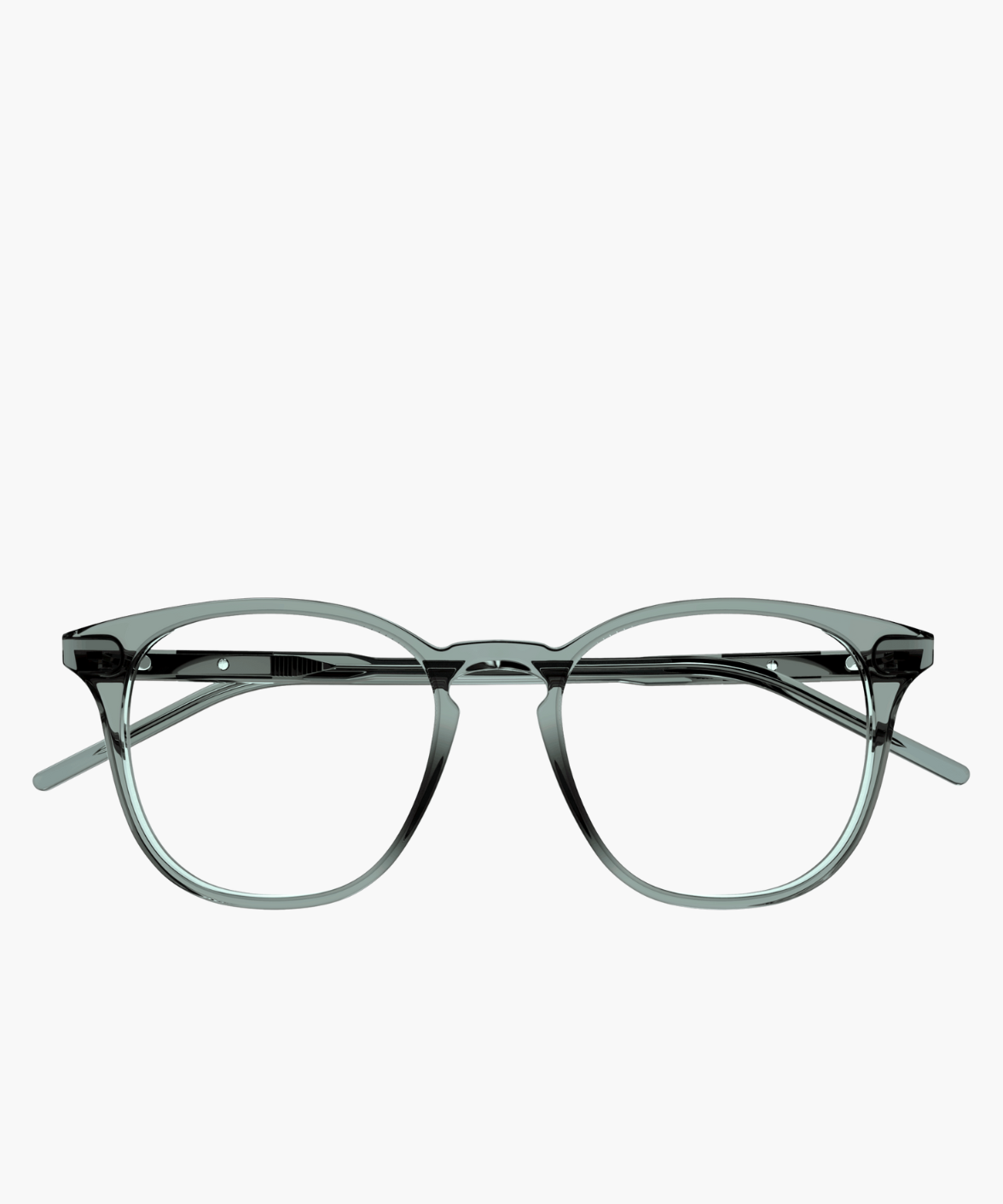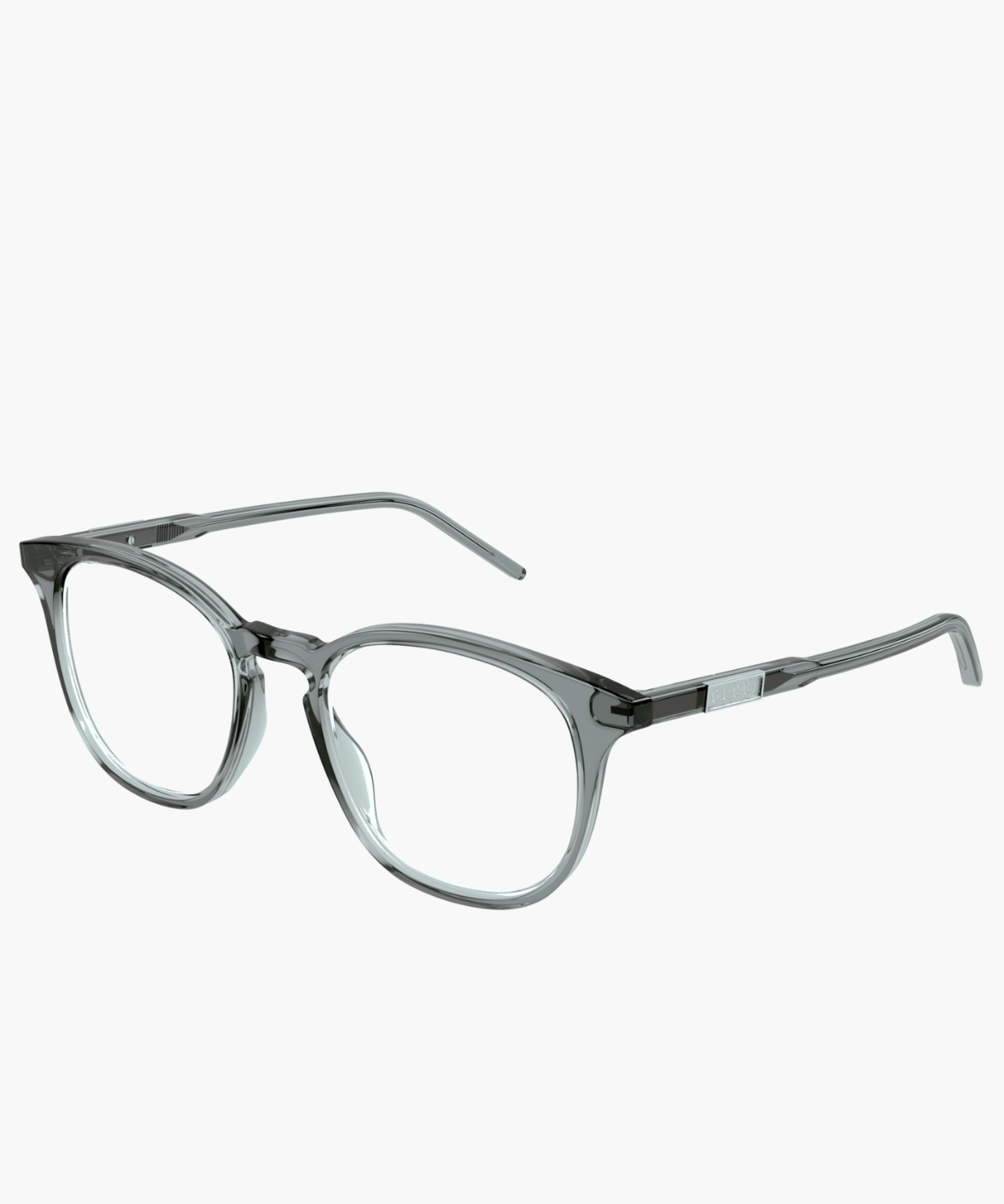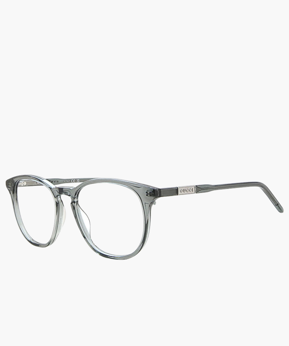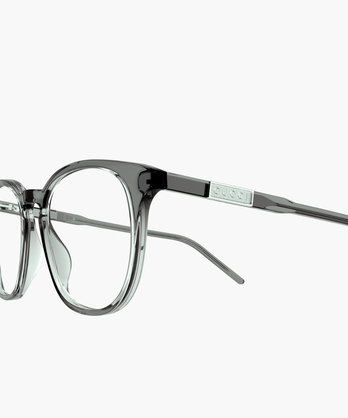 A clean squoval silhouette crafted entirely from acetate, offering a vintage-inspired look with modern ease. The clear grey frame brings a subtle, effortless style, while gold plaque details on both temples highlight the refined Gucci lettering. Full-rim construction ensures durability and comfort, making this an understated yet distinctive everyday piece.