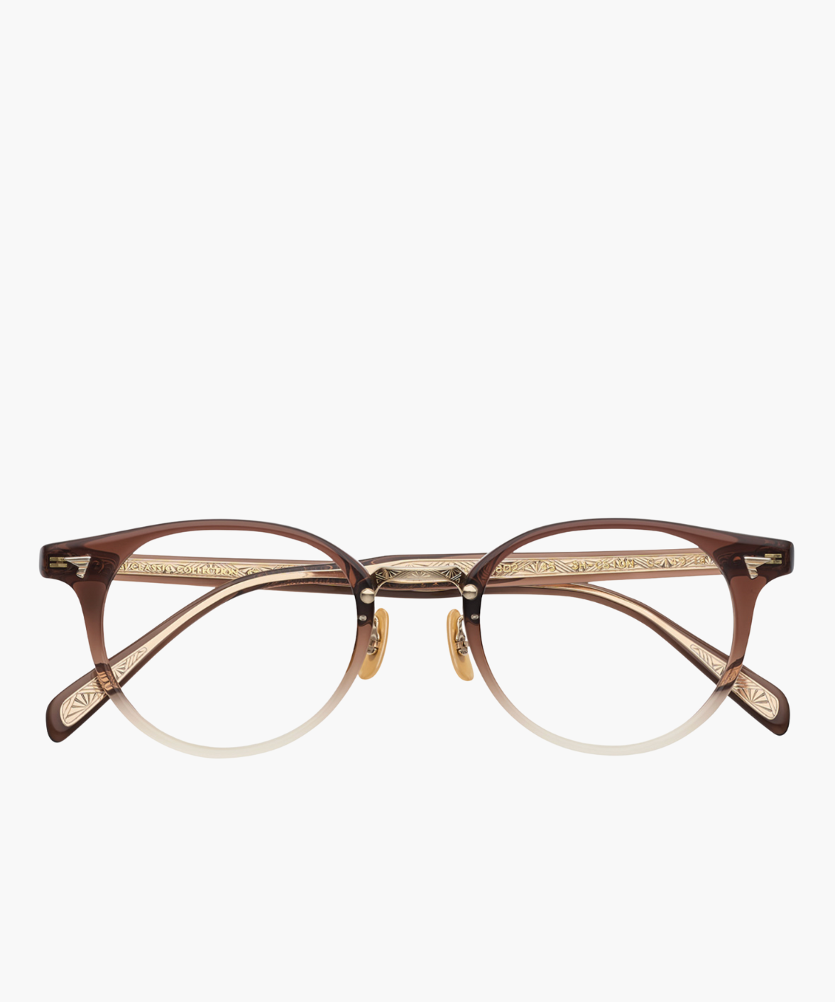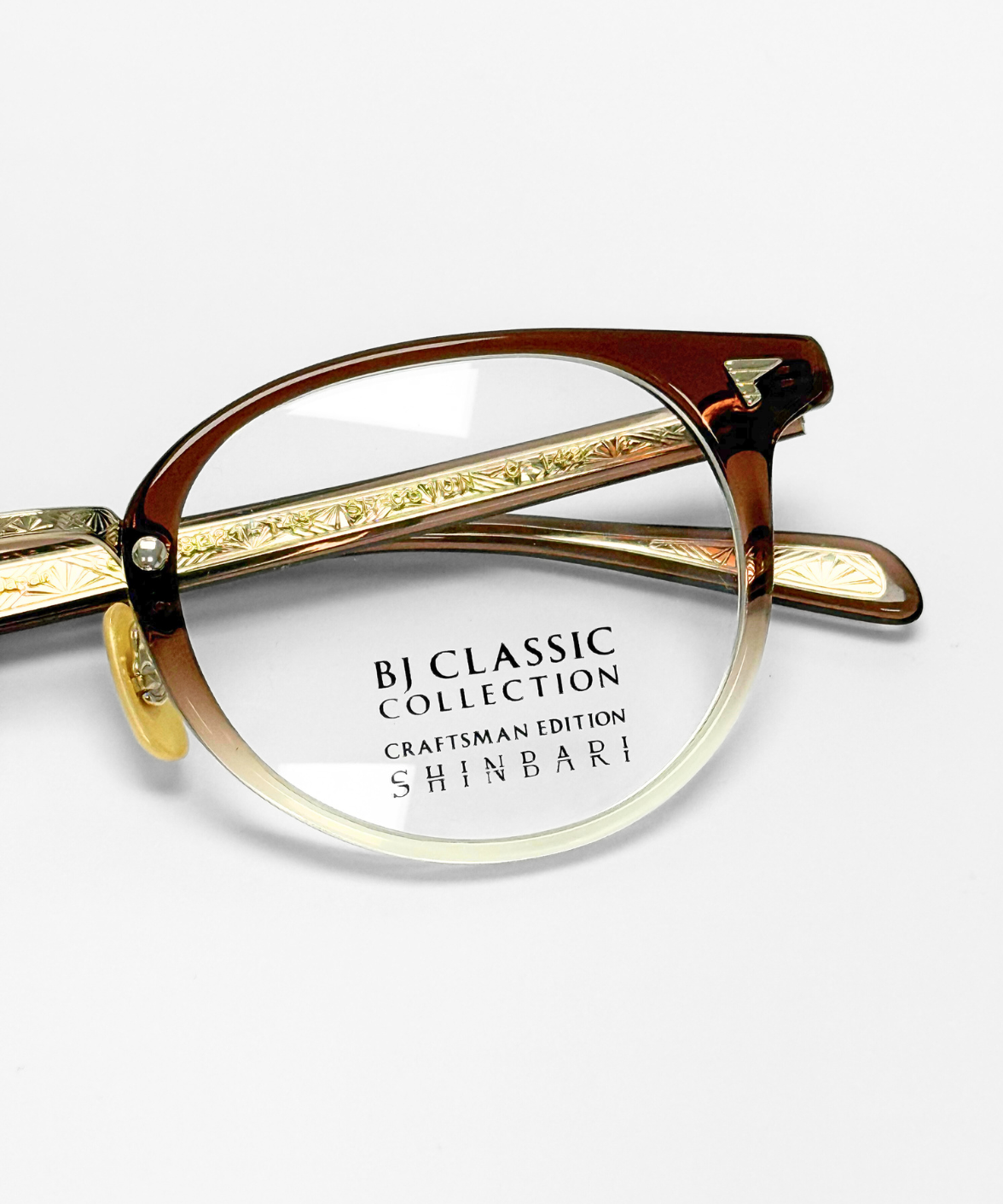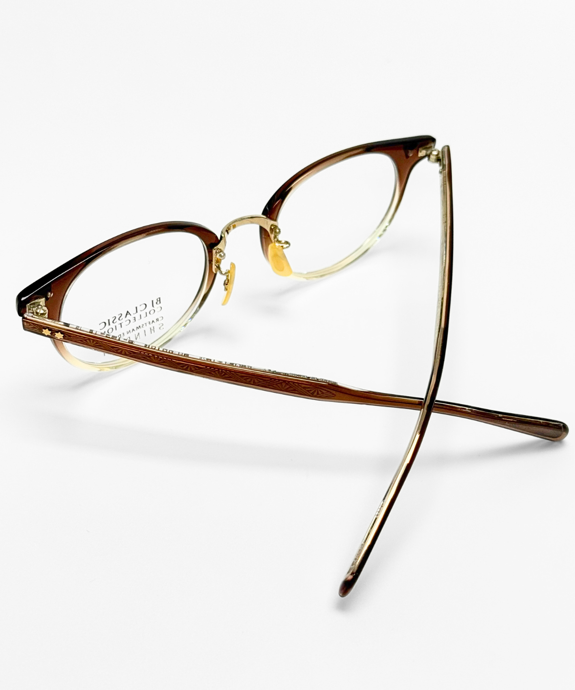 The SHINBARI SH-C510N showcases the artistry of traditional celluloid craftsmanship. This round frame features a clean, minimal silhouette that highlights the natural depth and sheen of the brown-clear material. The hand-polished finish brings out a warm, vintage glow unique to celluloid eyewear.