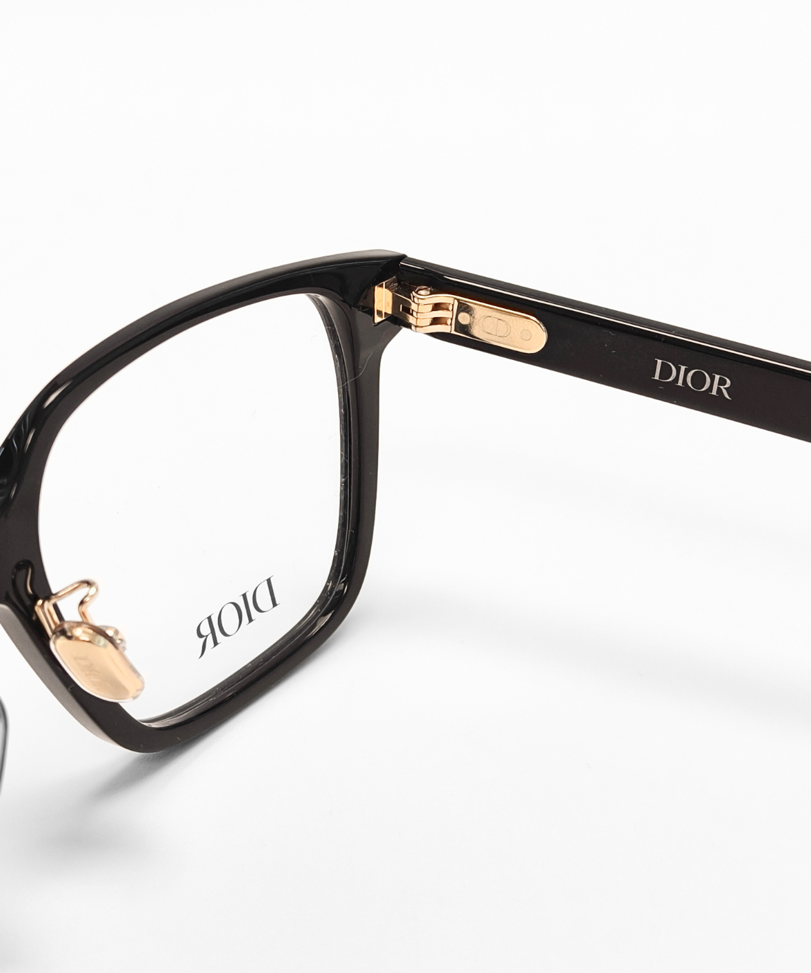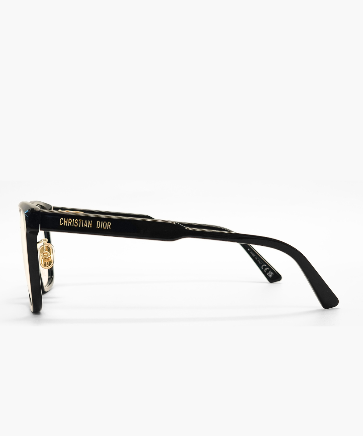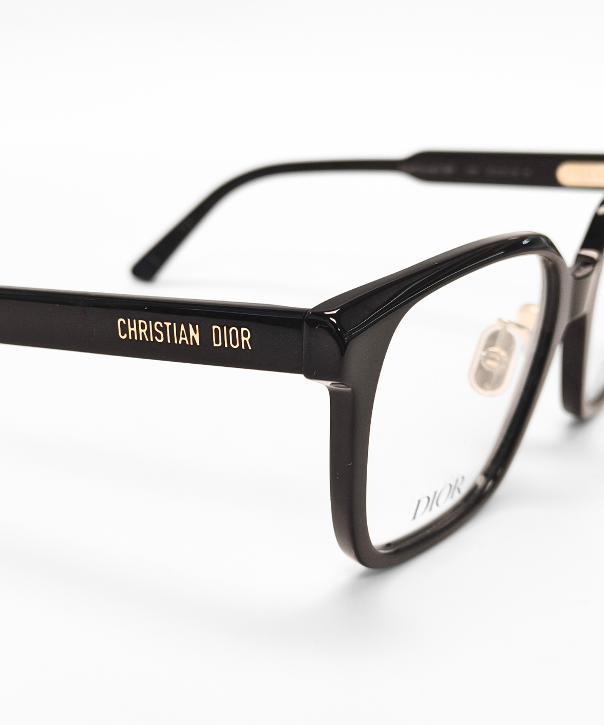 Gold-tone Christian Dior lettering along the temples adds a touch of signature luxury, contrasting subtly with the deep black frame. Adjustable nose pads ensure comfort and stability, making the design suitable for everyday wear.