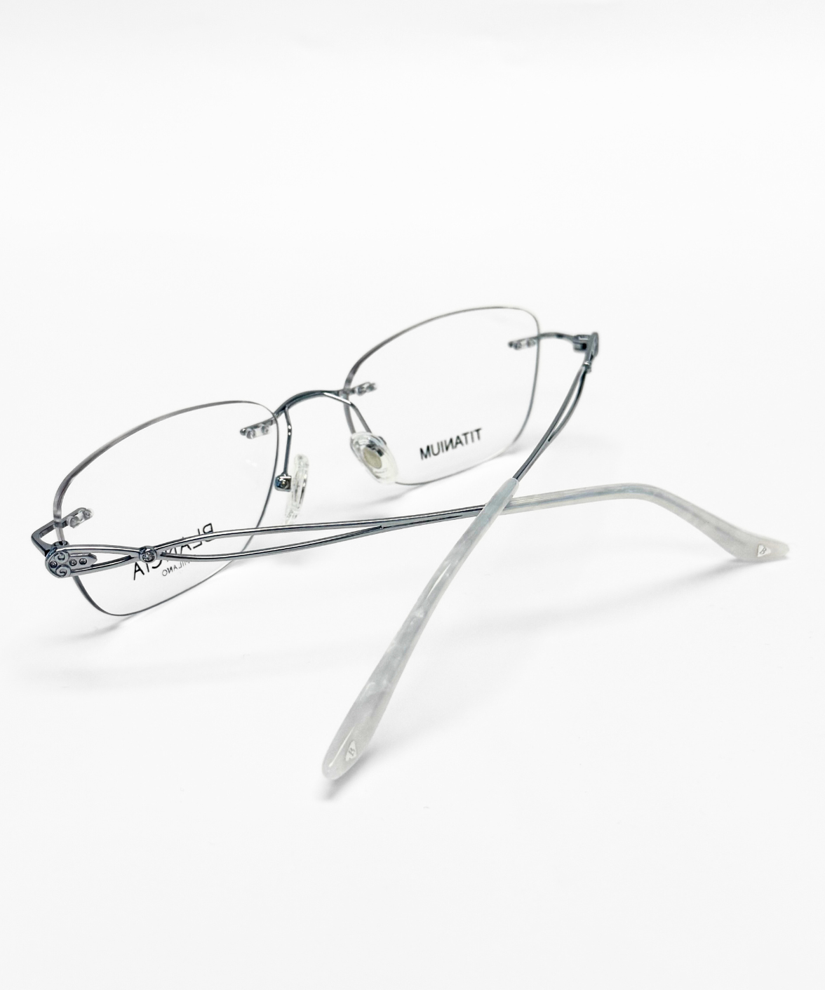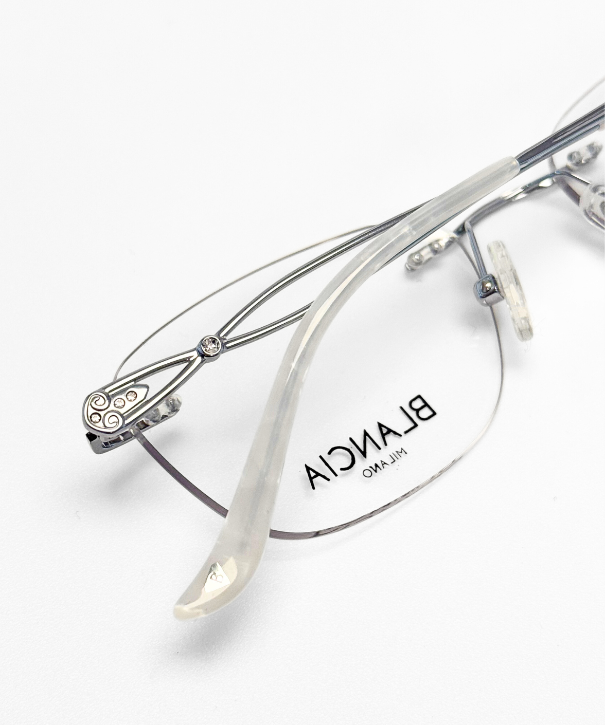 The Blancia BC452 eyeglasses feature a refined rimless rectangular silhouette crafted from ultra-lightweight titanium. The silver structure is paired with uniquely sculpted temples and pearl white temple tips, creating a clean yet expressive design. Adjustable nose pads provide comfort, while the frameless construction enhances the feeling of lightness and precision.